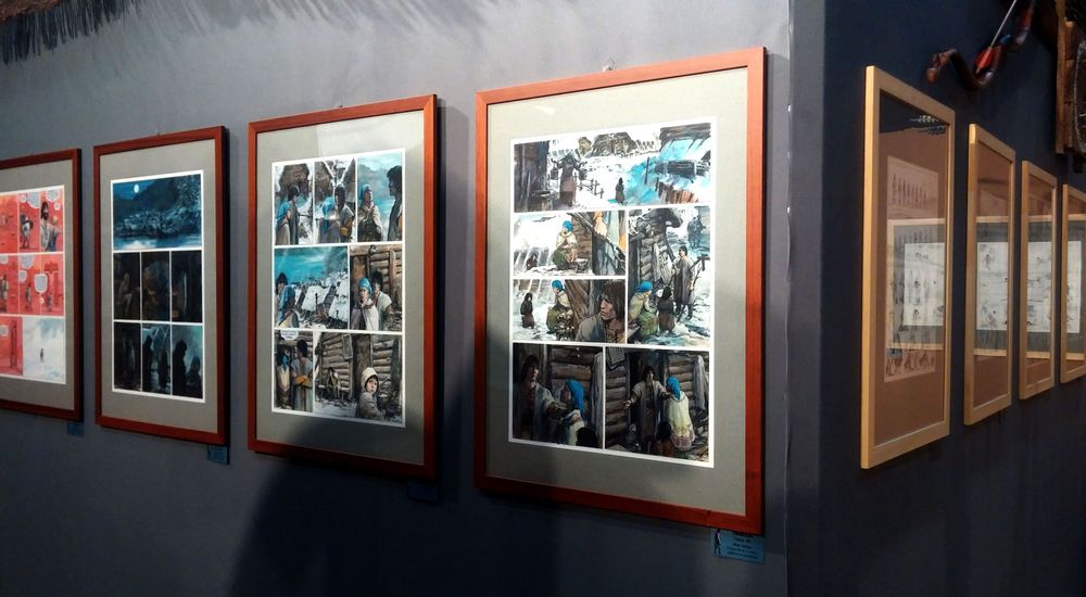 Fruit d’un travail collectif de plusieurs mois, l’exposition éphémère (3 jours…) permettait au visiteur de s’immerger dans le monde de Thorgal grâce aux éléments de scénographie emblématiques de la série (la cabane, la barque, l’arc, la porte du 2ème monde…) et à l’univers musical imaginé par Jean Luc. Ce décor « sonore » apportait une dimension et un relief supplémentaires aux thèmes Thorgaliens évoqués. Il n’y avait plus qu’à se laisser porter au gré des planches, puis à se faire happer par la force du trait de Rosinski, et la puissance de ses noirs et blancs ou de ses couleurs.