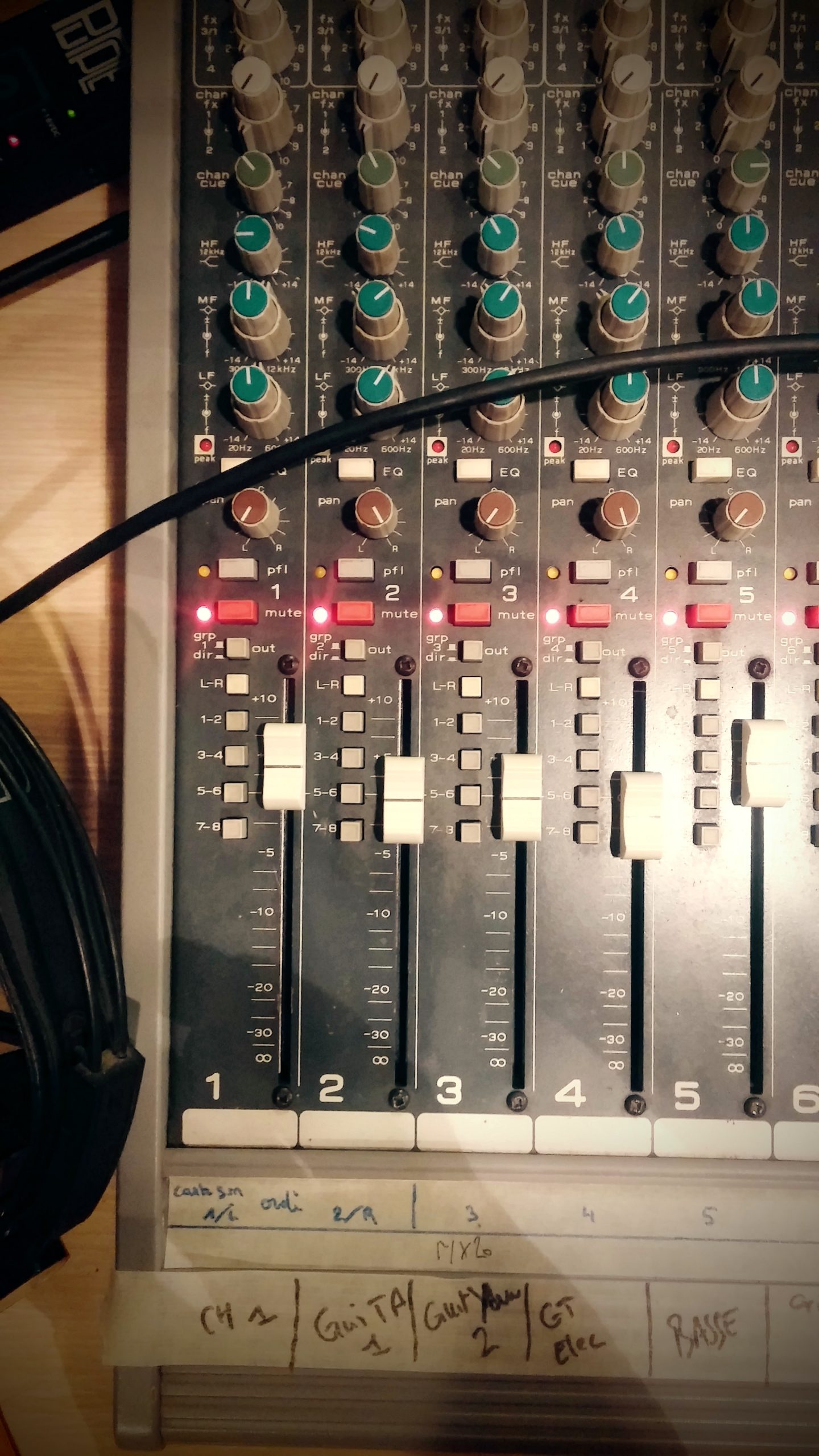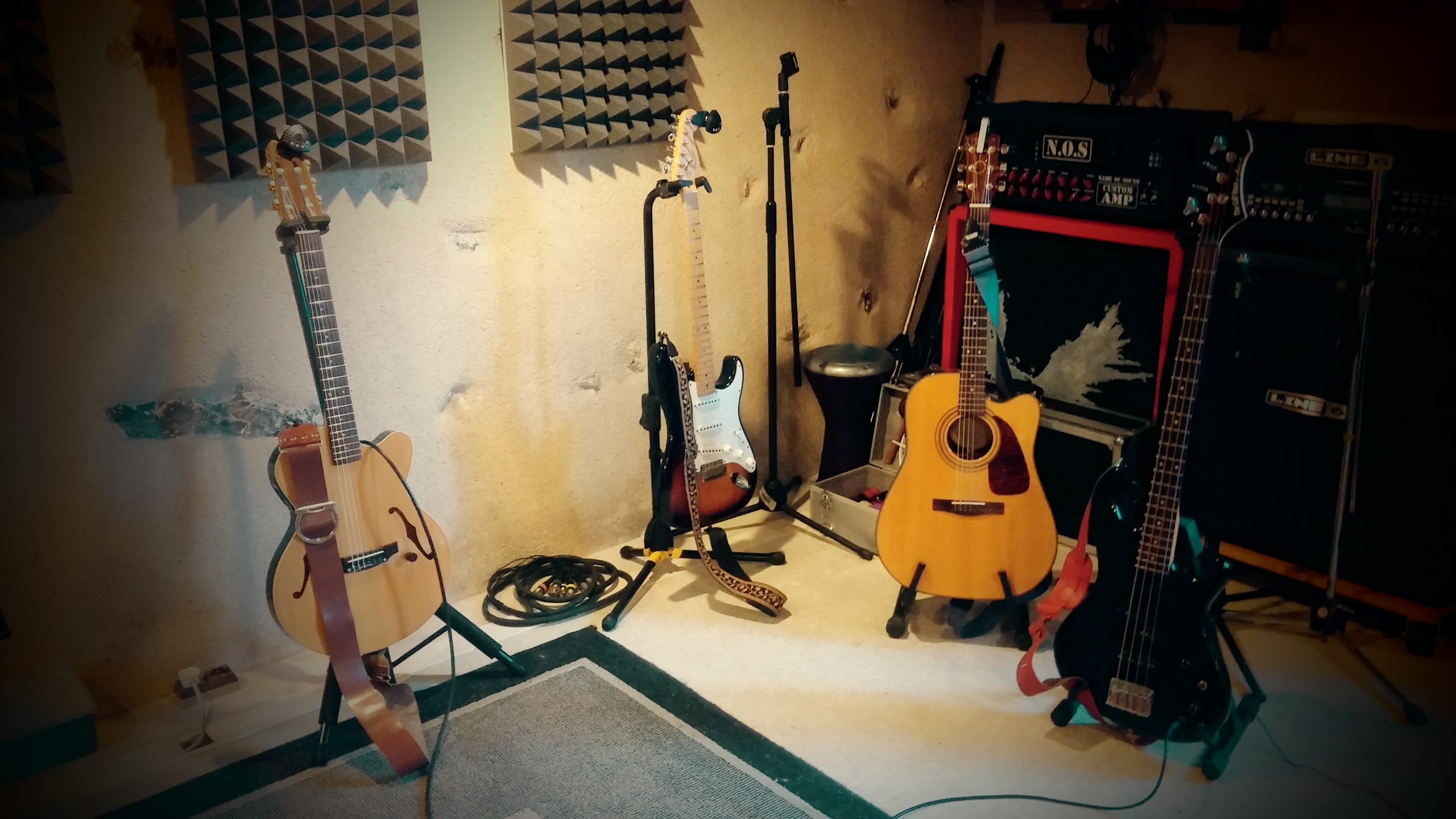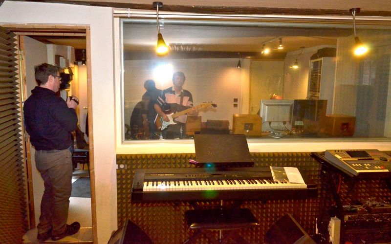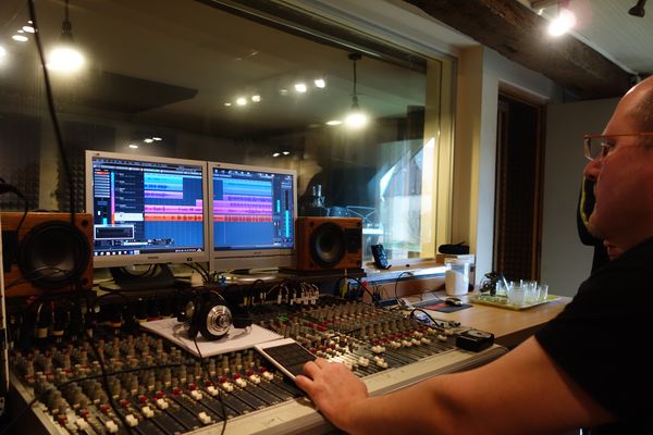 Nous avons donc commencé par enregistrer les chansons complètes en séparant les musiciens et instruments dans les deux salles à disposition, la cabine et la régie, afin d’éviter la diaphonie acoustique (reprise par un micro du son des autres instruments que celui qu’il est sensé capter).